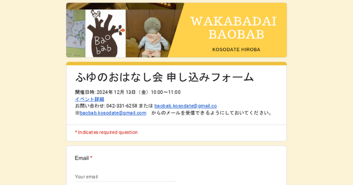 申し込みフォーム または 若葉台バオバブ保育園 042-331-6258 まで